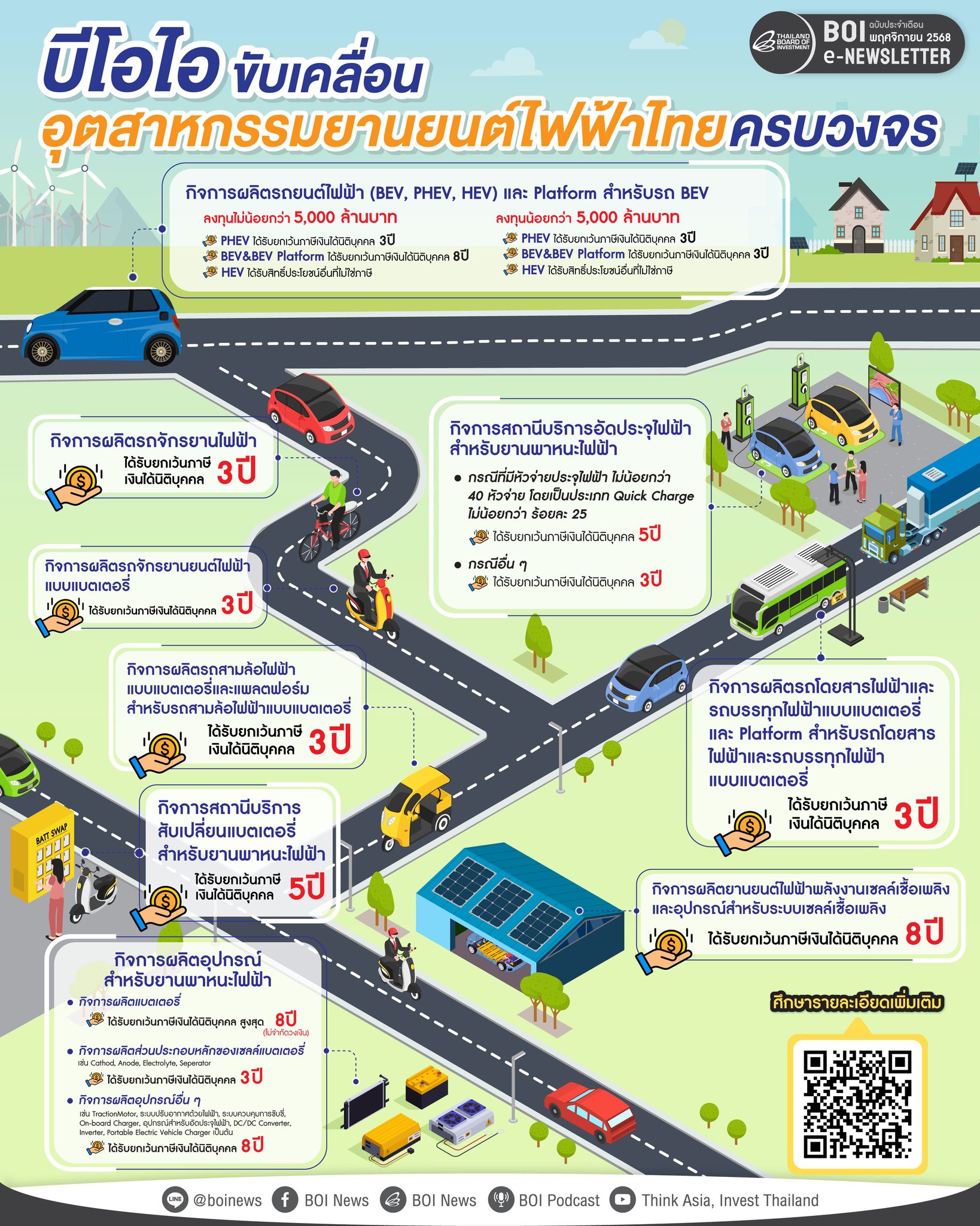 บีโอไอเดินหน้าขับเคลื่อนเศรษฐกิจสีเขียวของไทย เปิดสิทธิประโยชน์การลงทุนด้าน ยานยนต์ไฟฟ้า (EV) แบบครบวงจร ครอบคลุมตั้งแต่การผลิตยานยนต์ อุปกรณ์และชิ้นส่วน ไปจนถึงสถานีชาร์จ พร้อมยกเว้นภาษีเงินได้นิติบุคคลสูงสุด 8 ปีแบบไม่จำกัดวงเงิน เพื่อเร่งสร้างระบบนิเวศอุตสาหกรรม EV ที่แข็งแกร่ง รองรับเป้าหมายการผลิต 750,000 คันภายในปี 2030 และผลักดันประเทศไทยสู่การเป็น ศูนย์กลางการผลิตและนวัตกรรม EV แห่งอาเซียน