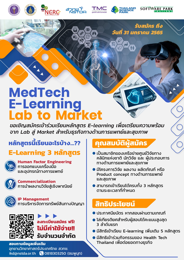 อุทยานวิทยาศาสตร์ประเทศไทย สำนักงานพัฒนาวิทยาศาสตร์และเทคโนโลยีแห่งชาติ (สวทช.) ขอเชิญท่านเข้าร่วมเรียนหลักสูตร E-learning เพื่อเตรียมความพร้อมจากงานวิจัยสู่การขยายผลงานออกสู่เชิงพาณิชย์ ซึ่งได้รับเงินทุนสนับสนุนจากโครงการศูนย์วิจัยทางคลินิกแห่งชาติ (NCRC) คณะแพทยศาสตร์ศิริราชพยาบาล มหาวิทยาลัยมหิดล โดยรับสมัครนักวิจัย ผู้ประกอบการ ทางด้านการแพทย์และสุขภาพ ที่ต้องการขยายผลงานออกสู่เชิงพาณิชย์ เข้าร่วมอบรมหลักสูตร E-Learning เพื่อเพิ่มขีดความสามารถให้สามารถพัฒนาต่อยอดงานวิจัยและนวัตกรรมให้สามารถขยายผลทางด้านการตลาดได้อย่างมีประสิทธิภาพ อีกทั้งช่วยพัฒนาและเพิ่มเติมความรู้ความเข้าใจให้กับบุคลากร