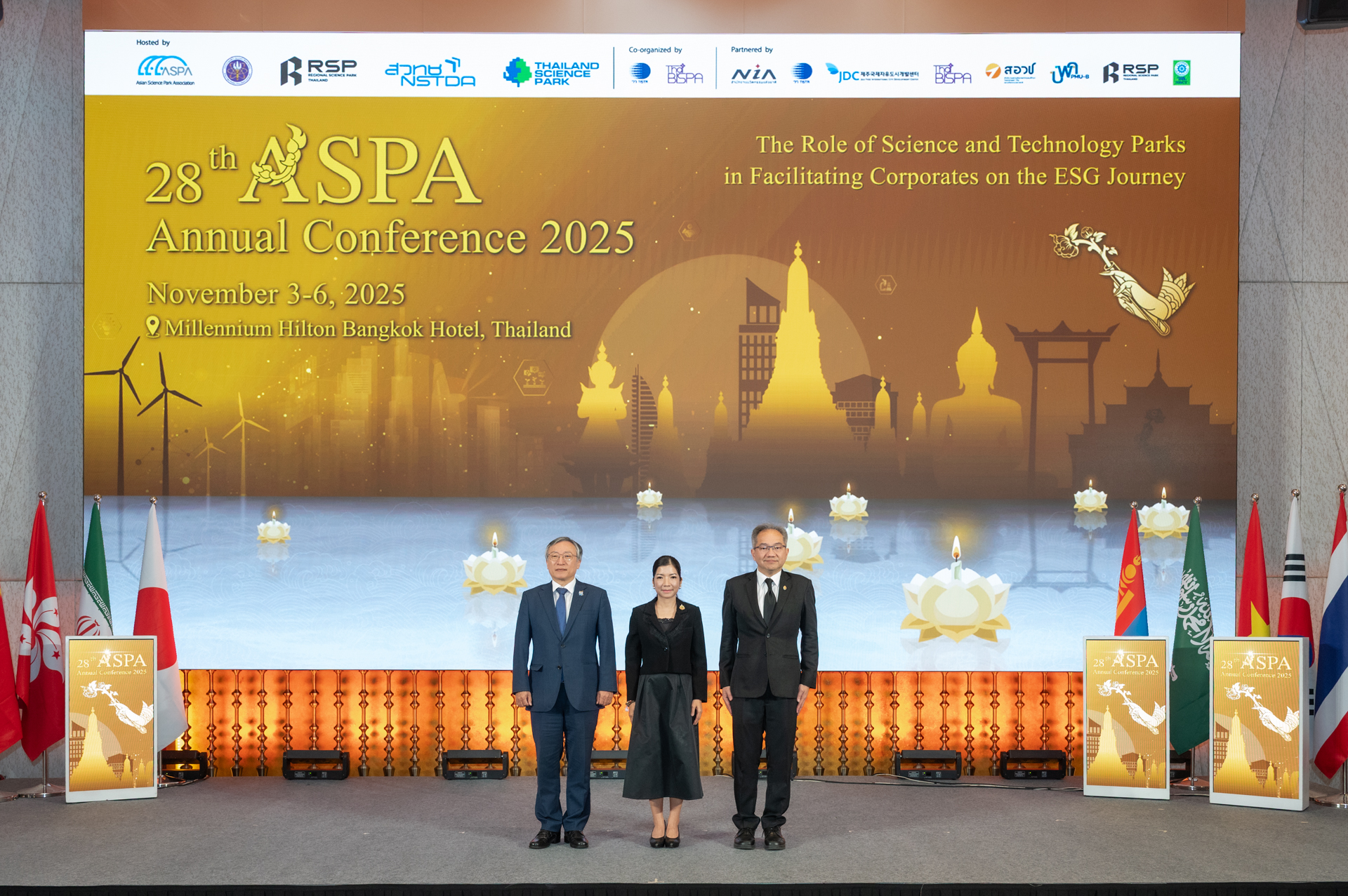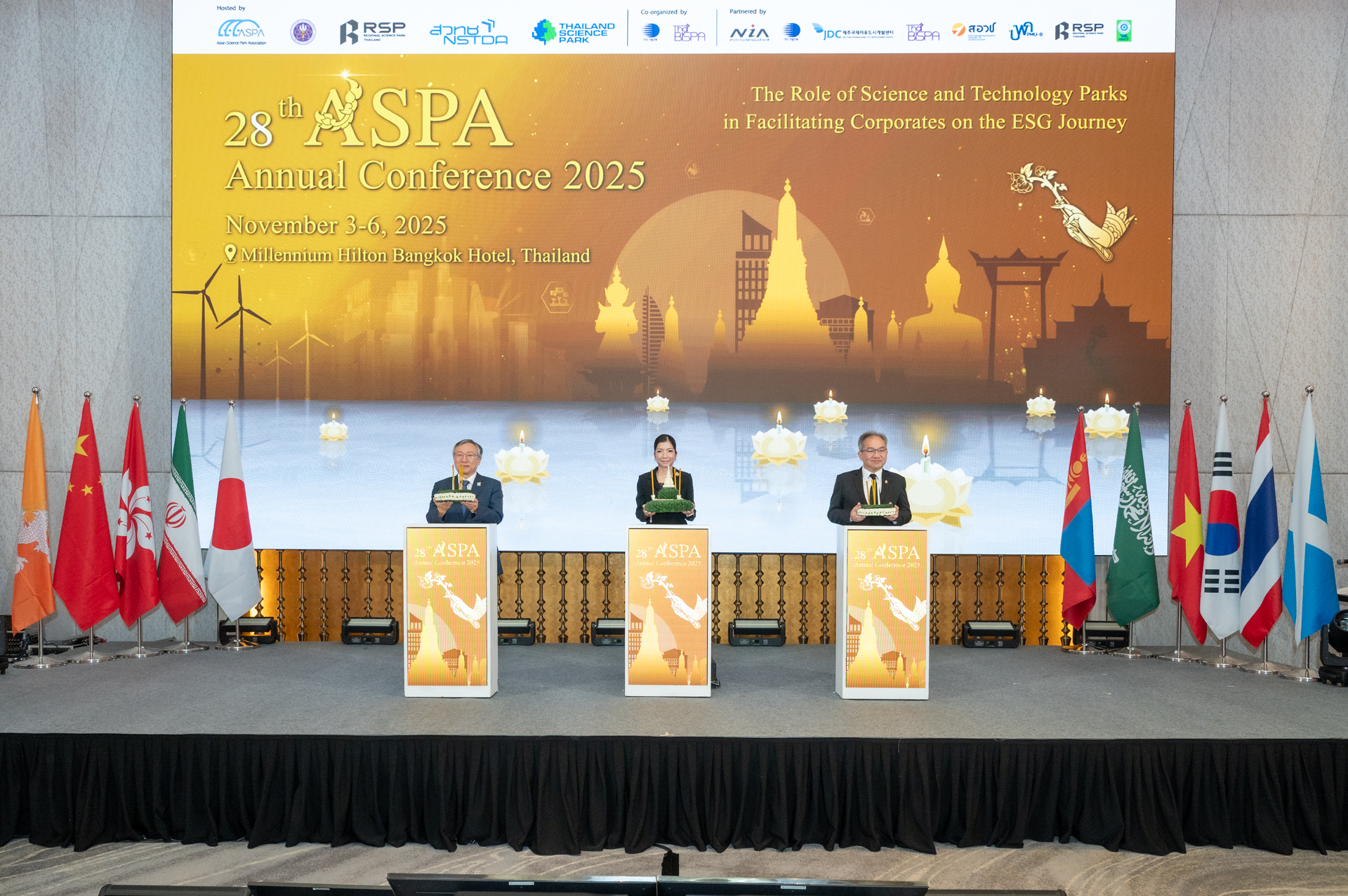 (วันที่ 4 พฤศจิกายน 2568) ณ Grand Ballroom ชั้น 2 โรงแรมมิลเลนเนียม ฮิลตัน: กระทรวงการอุดมศึกษา วิทยาศาสตร์ วิจัยและนวัตกรรม (อว.) สำนักงานพัฒนาวิทยาศาสตร์และเทคโนโลยีแห่งชาติ (สวทช.) โดยอุทยานวิทยาศาสตร์ประเทศไทย (Thailand Science Park) รวมถึงอุทยานวิทยาศาสตร์ภูมิภาคทั่วประเทศภายใต้สำนักงานปลัดกระทรวงการอุดมศึกษา วิทยาศาสตร์ วิจัยและนวัตกรรม (สป.อว.) เป็นเจ้าภาพในการจัดประชุมประจำปีสมาคมอุทยานวิทยาศาสตร์แห่งเอเชีย (ASPA Annual Conference 2025) ครั้งที่ 28 เวทีระดับนานาชาติภายใต้สมาคมอุทยานวิทยาศาสตร์เอเชีย (Asian Science Park Association, ASPA) ที่ส่งเสริมความร่วมมือด้านวิทยาศาสตร์ เทคโนโลยี และนวัตกรรม ระหว่างอุทยานวิทยาศาสตร์ในเอเชีย ซึ่งมีสมาชิกจากกว่า 15 ประเทศทั่วเอเชีย โดยในปีนี้ประเทศไทยได้รับเกียรติเป็นเจ้าภาพจัดการประชุมภายใต้หัวข้อ "บทบาทของอุทยานวิทยาศาสตร์และเทคโนโลยีในการส่งเสริมองค์กรธุรกิจสู่เส้นทางอีเอสจี (The Role of Science and Technology Parks in Facilitating Corporates on the ESG Journey)" โอกาสนี้ได้รับเกียรติจากนางสาวพิมพ์พร ชีวานันท์ เลขานุการรัฐมนตรีว่าการกระทรวงการอุดมศึกษา วิทยาศาสตร์ วิจัยและนวัตกรรม เป็นประธานเปิดงาน และได้รับเกียรติจากวิทยากรผู้ทรงคุณวุฒิ อาทิ สก็อตแลนด์ สาธารณรัฐเกาหลี สาธารณรัฐประชาชนจีนและภูฎาน ที่มาร่วมแบ่งปันประสบการณ์เกี่ยวกับระบบนิเวศนวัตกรรม (Innovation Ecosystem) และการเปลี่ยนผ่านสู่ความยั่งยืนเพื่อผู้ประกอบการธุรกิจเทคโนโลยีด้านเศรษฐกิจ สังคม และการกำกับดูแล (อีเอสจี)