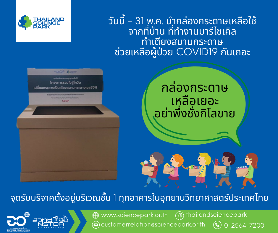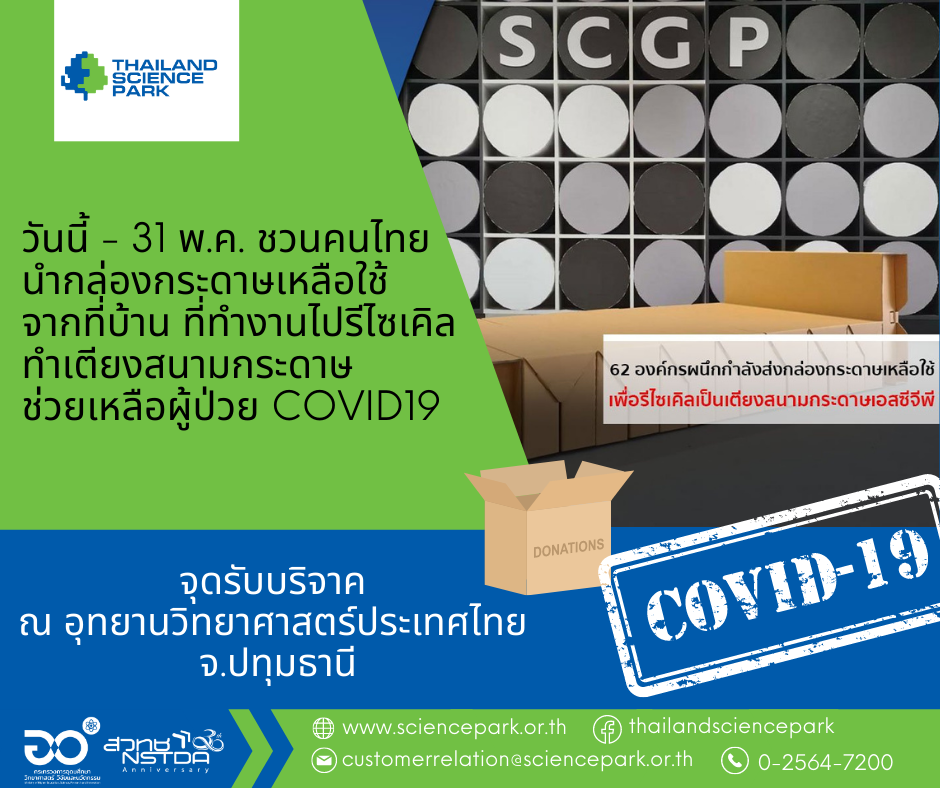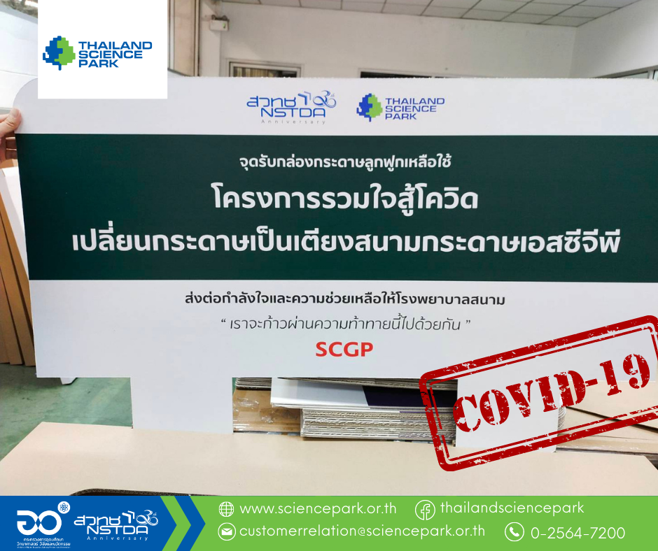 อุทยานวิทยาศาสตร์ประเทศไทย ร่วมกับ บริษัท เอสซีจี แพคเกจจิ้ง จำกัด (มหาชน) ผนึกกำลัง “รวมใจสู้โควิด” เปลี่ยนกระดาษเป็นเตียงสนาม รณรงค์ให้คนไทยรักสิ่งแวดล้อม ด้วยการหมุนเวียนนำทรัพยากรกลับมาใช้ใหม่ พร้อมกับช่วยเหลือสังคมในช่วงสถานการณ์การแพร่ระบาดของโรคโควิด 19 โดยเปิดจุดรับกล่องกระดาษเหลือใช้เพื่อนำกลับมารีไซเคิลเป็นเตียงสนามกระดาษ ส่งมอบแก่ผู้รับการสนับสนุนทั่วประเทศ
