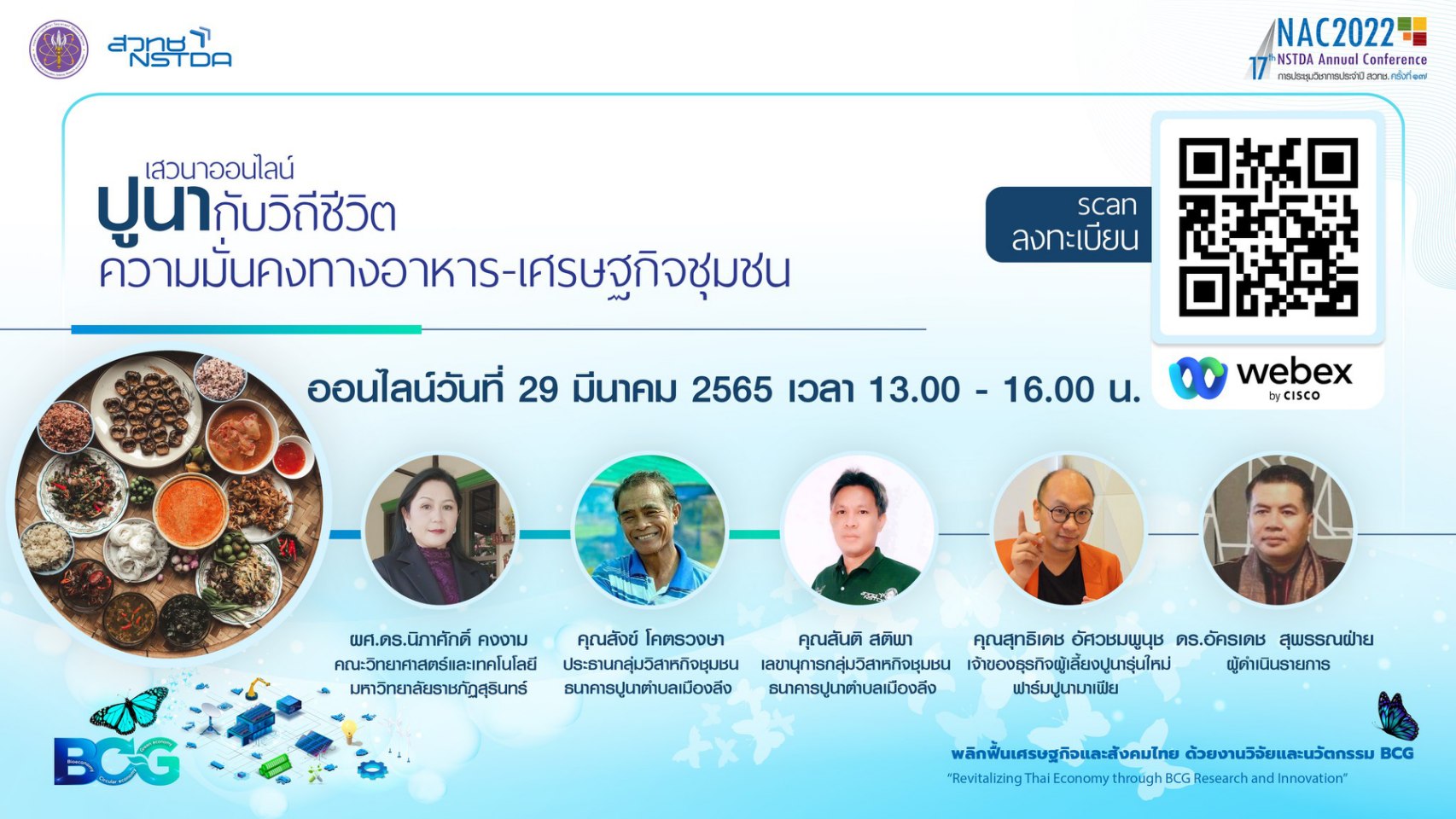 กระทรวงการอุดมศึกษา วิทยาศาสตร์ วิจัยและนวัตกรรม (อว.) สำนักงานพัฒนาวิทยาศาสตร์และเทคโนโลยีแห่งชาติ (สวทช.) โดยสถาบันการจัดการเทคโนโลยีและนวัตกรรมเกษตร (สท.) และมหาวิทยาลัยราชภัฏสุรินทร์ จัดเสวนาออนไลน์เรื่อง “ปูนา กับวิถีชีวิต-ความมั่นคงทางอาหาร-เศรษฐกิจ” ในวันที่ 29 มีนาคม 2565 เวลา 13.00 – 16.00 น. ภายใต้งานประชุมวิชาการประจำปี สวทช. ครั้งที่ 17 (NAC2022: NSTDA Annual Conference 2022) ซึ่งจัดขึ้นระหว่างวันที่ 28 – 31 มีนาคม 2565