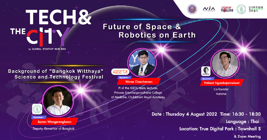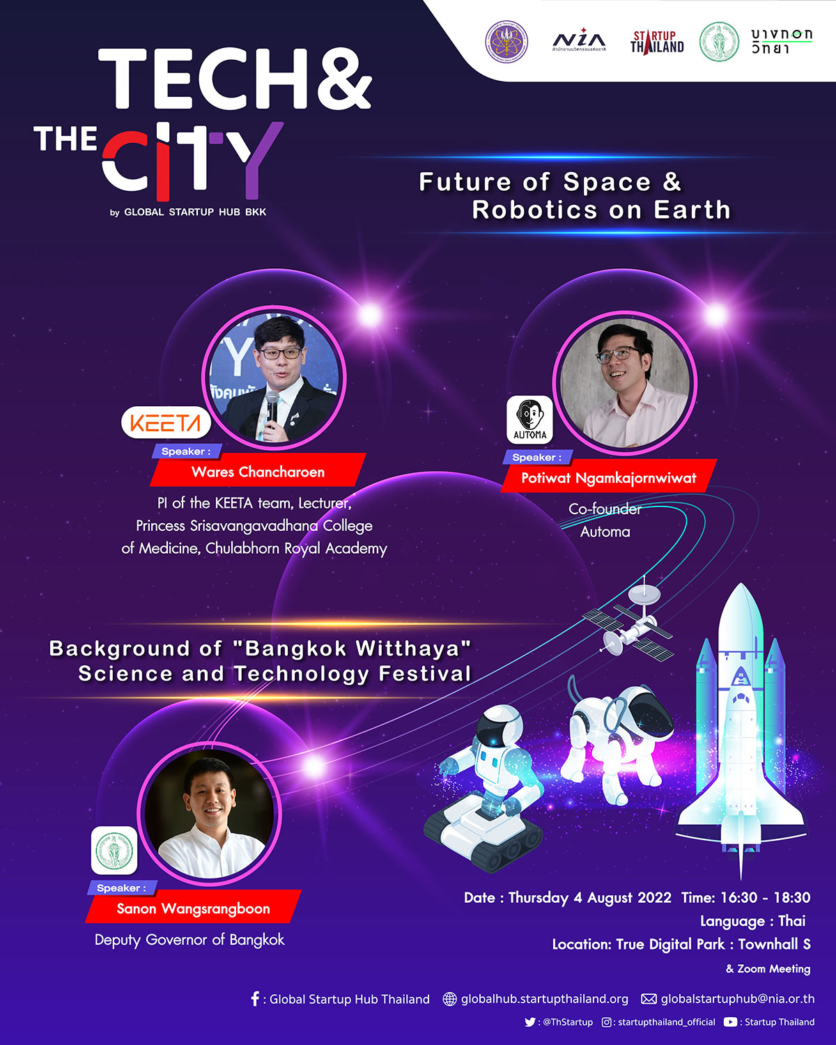 เนื่องจาก เดือนสิงหาคม เป็นเดือนแห่งวิทยาศาสตร์ งาน Tech & The City หัวข้อ : "Future of Space & Robotics on Earth" จึงเป็นส่วนหนึ่งของ กิจกรรม “บางกอกวิทยา” เทศกาลวิทยาศาสตร์และเทคโนโลยี ซึ่งเป็น 1 ใน 12 เทศกาลตลอดปีทั่วกรุงเทพฯ ที่จะจัดขึ้นในเดือนสิงหาคมนี้ เพื่อเปลี่ยนกรุงเทพให้เป็นห้องเรียนวิทยาศาสตร์ขนาดใหญ่ โดย คุณชัชชาติ สิทธิพันธุ์ ผู้ว่าราชการกรุงเทพมหานคร พร้อมด้วย คุณศานนท์ หวังสร้างบุญ รองผู้ว่าราชการกรุงเทพมหานคร