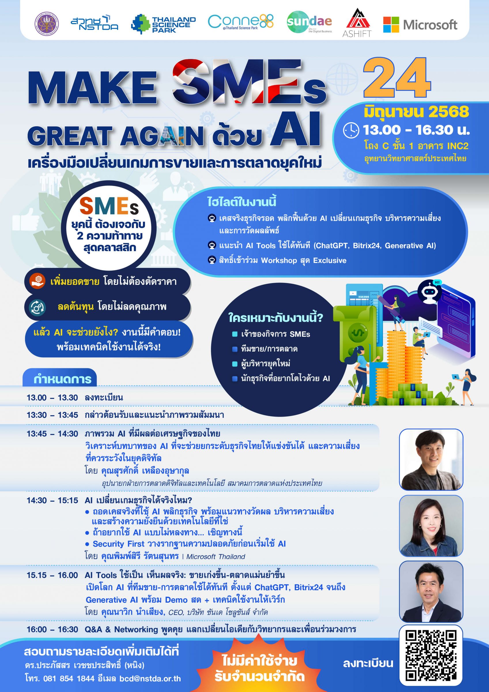อุทยานวิทยาศาสตร์ประเทศไทย (อวท.) สำนักงานพัฒนาวิทยาศาสตร์และเทคโนโลยีแห่งชาติ (สวทช.) ร่วมกับ บริษัท ซันเด โซลูชันส์ จำกัด, บริษัท เอซิฟท์ จำกัด และ Microsoft Thailand ขอเชิญผู้ประกอบการและผู้สนใจเข้าร่วมสัมมนาสุดเข้มข้น "MAKE SMEs GREAT AGAIN ด้วย AI: เครื่องมือเปลี่ยนเกมการขายและการตลาดยุคใหม่"