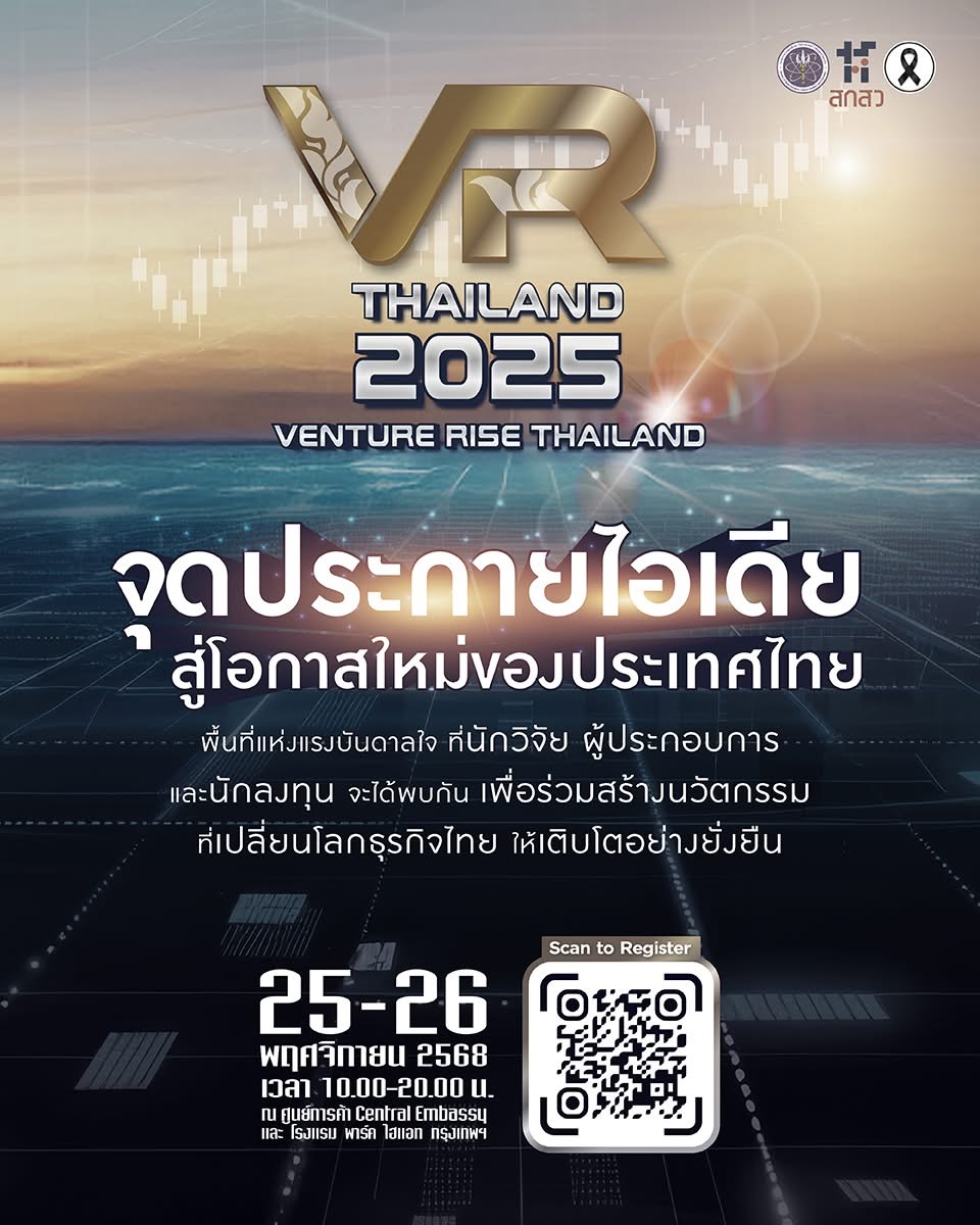 สำนักงานคณะกรรมการส่งเสริมวิทยาศาสตร์ วิจัยและนวัตกรรม (สกสว.) ขอเชิญร่วมงาน “Venture Rise Thailand 2025” เวทีแห่งแรงบันดาลใจที่เปิดพื้นที่ให้นักวิจัย ผู้ประกอบการ และนักลงทุน มาแลกเปลี่ยน และสร้างโอกาสความร่วมมือใหม่ เพื่อขับเคลื่อนนวัตกรรมไทยสู่การเติบโตอย่างยั่งยืน