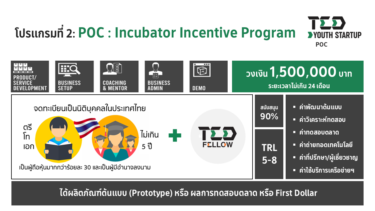 POC (Incubator Incentive Program) - ให้การสนับสนุนทุนไม่เกินร้อยละ 90 ของมูลค่าโครงการ ในวงเงินไม่เกิน 1,500,000 บาท เพื่อต่อยอดการพัฒนาผลิตภัณฑ์หรือบริการต้นแบบให้พร้อมออกสู่ตลาด