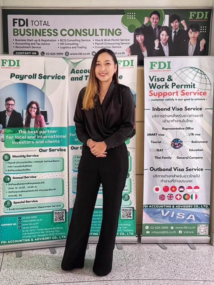คุณพัชราภรณ์ แนะนำ “FDI Group” ประกอบด้วย 5 บริษัทในเครือที่อยู่ในประเทศไทย นำทัพโดย บริษัท เอฟ ดี ไอ แอคเคาน์ติ้ง แอนด์ แอดไวซอรี่ จำกัด เราเป็นกลุ่มบริษัทที่ปรึกษาสัญชาติญี่ปุ่น-ไทย โดยบริษัทแรกที่ก่อตั้ง คือ เมื่อปี พ.ศ. 2538 คือบริษัท เอฟดีไอ คอร์ปอเรชั่น จำกัด โดยตลอด 29 ปีที่ผ่านมา กลุ่มบริษัท เอฟ ดี ไอ ให้บริการเป็นที่ปรึกษาทางด้านการดำเนินธุรกิจแบบครบวงจรสำหรับผู้ประกอบการทั้งในและต่างประเทศที่มาประกอบธุรกิจในไทย ตั้งแต่การจดจัดตั้งกิจการ วางระบบการบริหารงาน ครอบคลุมทั้งบริการด้านบัญชี การจัดการภาษี จัดทำเงินเดือน ให้คำปรึกษาด้านทรัพยากรบุคคล จัดหาบุคลากรและการขอใบอนุญาตเพื่อดำเนินธุรกิจต่างๆ บริการขอวีซ่า และใบอนุญาตการทำงานในประเทศไทย ให้คำแนะนำเกี่ยวกับการขอ BOI ดูแลจัดการเรื่องการจัดการศุลกากร การก่อสร้างโรงงาน ตลอดจนธุรกิจใหม่ของทาง กลุ่ม บริษัท เอฟ ดี ไอ คือบริการให้คำปรึกษาด้านการจัดการก๊าซเรือนกระจก ทั้งด้านการประเมิน การฝึกอบรม และการขึ้นทะเบียนคาร์บอนเครดิต