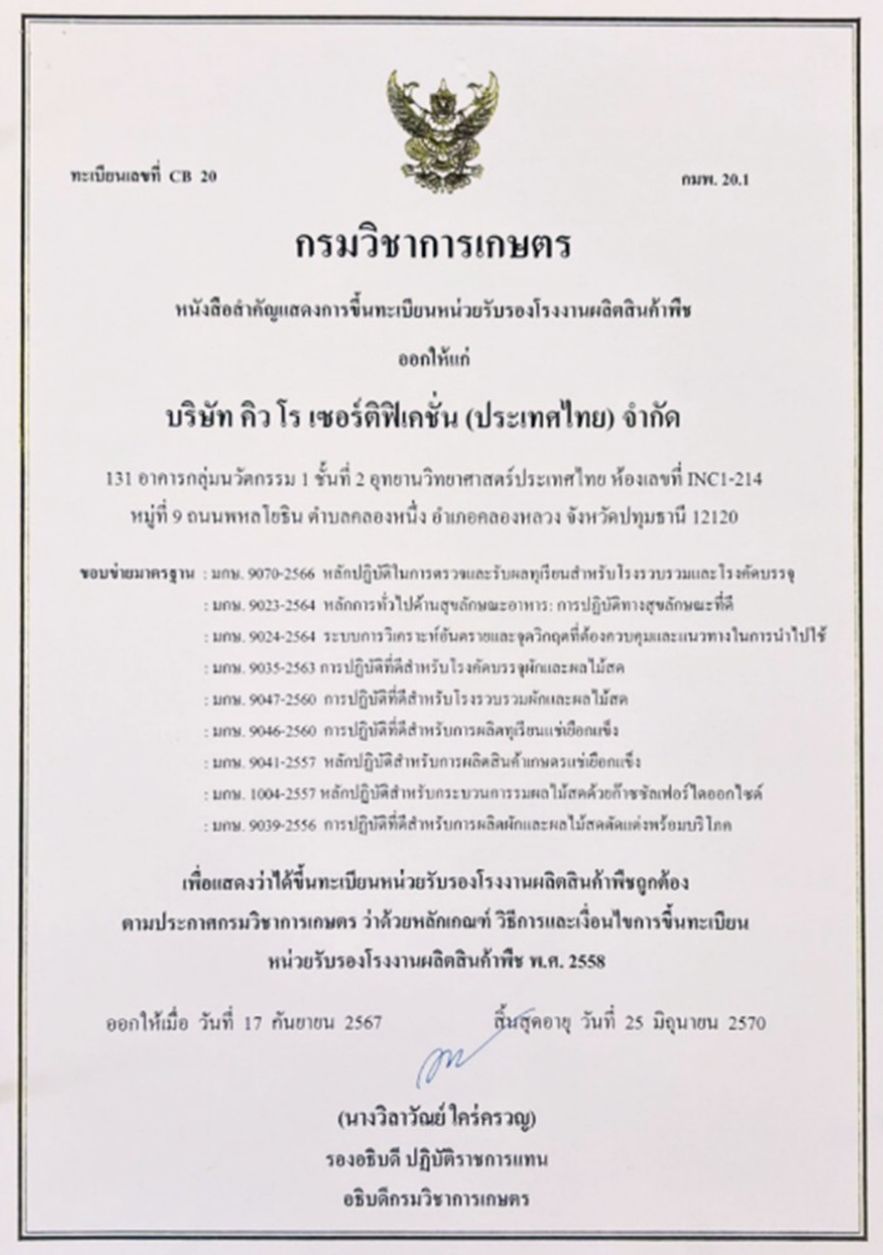 บริษัท คิว โร เซอร์ติฟิเคชั่น (ประเทศไทย) จำกัด ตั้งอยู่ที่ห้อง 214 อาคาร INC-1 เป็นบริษัทที่ได้รับการรับรองมาตรฐานจากภาครัฐที่มีระบบการบริหาร และการจัดการที่ทันสมัย พร้อมให้บริการตรวจประเมิน และให้การรับรองมาตรฐานสินค้าเกษตรและอาหารโดยเน้นการให้บริการ รวดเร็ว ถูกต้อง แม่นยำ เป็นกลาง มีคุณภาพเพื่อให้สินค้าที่ได้รับการรรับรองจากบริษัท ที่ได้รับการรับรองมาตรฐาน ISO/IEC 17021-1