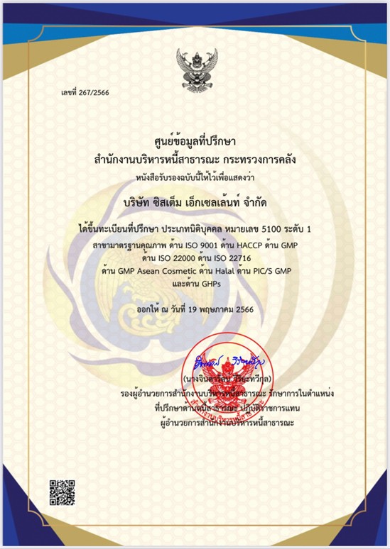 System Excellent เหมาะสำหรับผู้เริ่มต้นธุรกิจ พร้อมวางระบบธุรกิจแบบครบวงจร ตั้งแต่บริการออกแบบพัฒนาวิจัยและพัฒนาผลิตภัณฑ์ การจดทะเบียนเครื่องหมายการค้า ออกแบบโรงงานให้ถูกต้องตามระบบมาตรฐานของ อย. เรียกได้ว่า ช่วย “ติดกระดุมเม็ดแรก” ให้ถูกต้อง ทั้งขอใบอนุญาตโรงงาน ขอใบอนุญาตผลิตและขอใบอนุญาตนำเข้า บริการยื่นขอทะเบียน ขอเลข อย. บริการขอ Made in Thailand (MiT) บริการจดสมาชิกรหัสสากล GS1 เพื่อยกระดับในการดำเนินธุรกิจ บริการยื่นขอรับการส่งเสริมจาก BOI รวมทั้งการจดทะเบียนจัดตั้งบริษัท และสุดท้ายคือ การให้คำปรึกษาและการจัดฝึกอบรมระบบ GMP/ GHPs/ HACCP/ ISO 22000/ GMP Asean Cosmetic/ ISO 22716/ ISO 9001/ ISO14001/ ISO 45001/ ISO 13485 / GMP PIC/s / มาตรฐาน HALAL / มาตรฐานเกษตรอินทรีย์ (Organic Thailand) / Thailand Trust Mark / มาตรฐานอุตสาหกรรมเอส (มอก.เอส) และบริการแบบครบวงจร QMR, QMS, DCC บริการดูแลรักษาระบบในองค์กรแบบรายเดือน, 3 เดือน, 6 เดือน และรายปี เพื่อเพิ่มโอกาสธุรกิจสู่ตลาดสากล สร้างความยั่งยืนให้กับธุรกิจ
