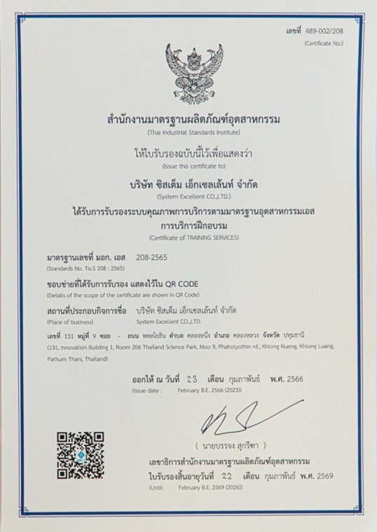 การบริการฝึกอบรม. มอก. เอส 208-2565. สำนักงานมาตรฐานผลิตภัณฑ์อุตสาหกรรม กระทรวงอุตสาหกรรม จึงมั่นใจได้ว่าบริการของเราผ่านการรับรองอย่างถูกต้อง มีมาตรฐานที่ดี มีคุณภาพที่จะช่วยยกระดับ ให้โรงงานและธุรกิจของคุณสามารถเติบโตได้อย่างยั่งยืน แข่งขันในโลกของการค้าได้อย่างสมบูรณ์แบบ
